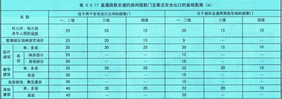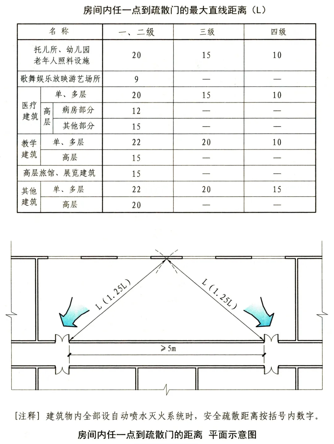 注:1 开向敞开式外廊的户门至最近安全出口的最大直线距离可按上表的规定增加5m。